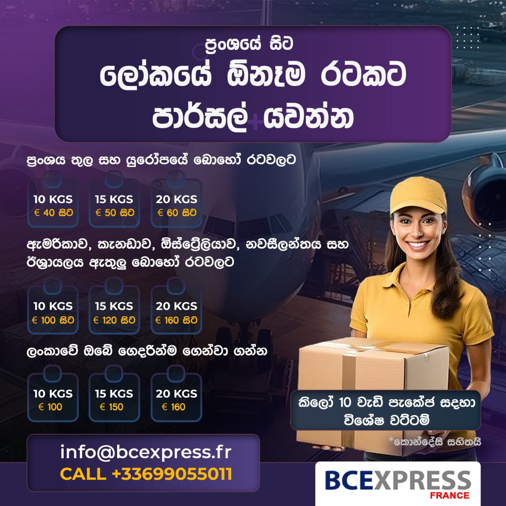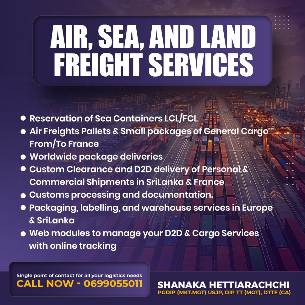 Regular shipment every week. Transit 10-14 days from the departure. Parcels are delivering to your home in SriLanka free of charge. Sending valuables are possible with additional cost. consignee needs to certify the ownership of these boxes.