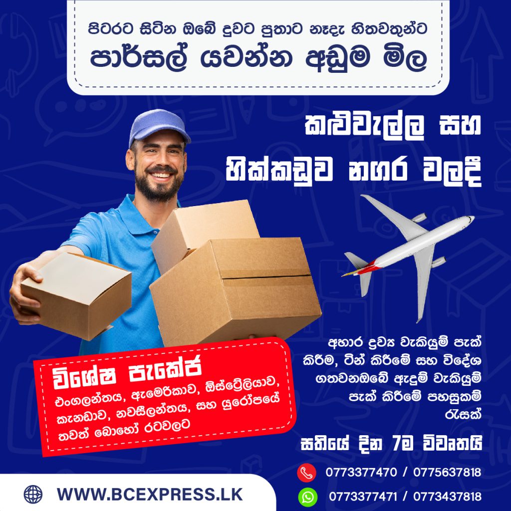 Transit 55 – 65 Days from departure. Standard boxes will be delivered to your home. Maximum weight of a box is 35Kgs. Sending valuables are prohibited. SriLanka Custom may request consignee to certify the ownership of these boxes.